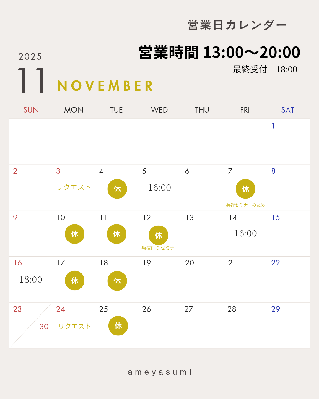 ameyasumi| 営業時間 | 月 | 火 | 水 | 木 | 金 | 土 | 日 | 祝 |
